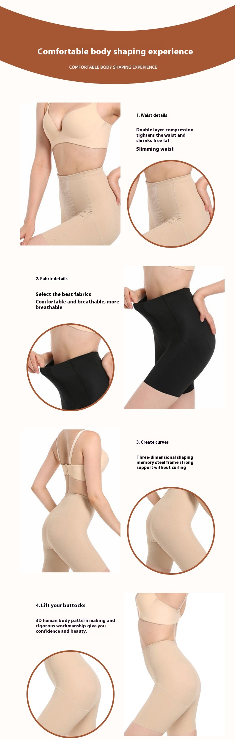 Fonction : soutien lombaire, sans coutures, effet push-up, ventre plat